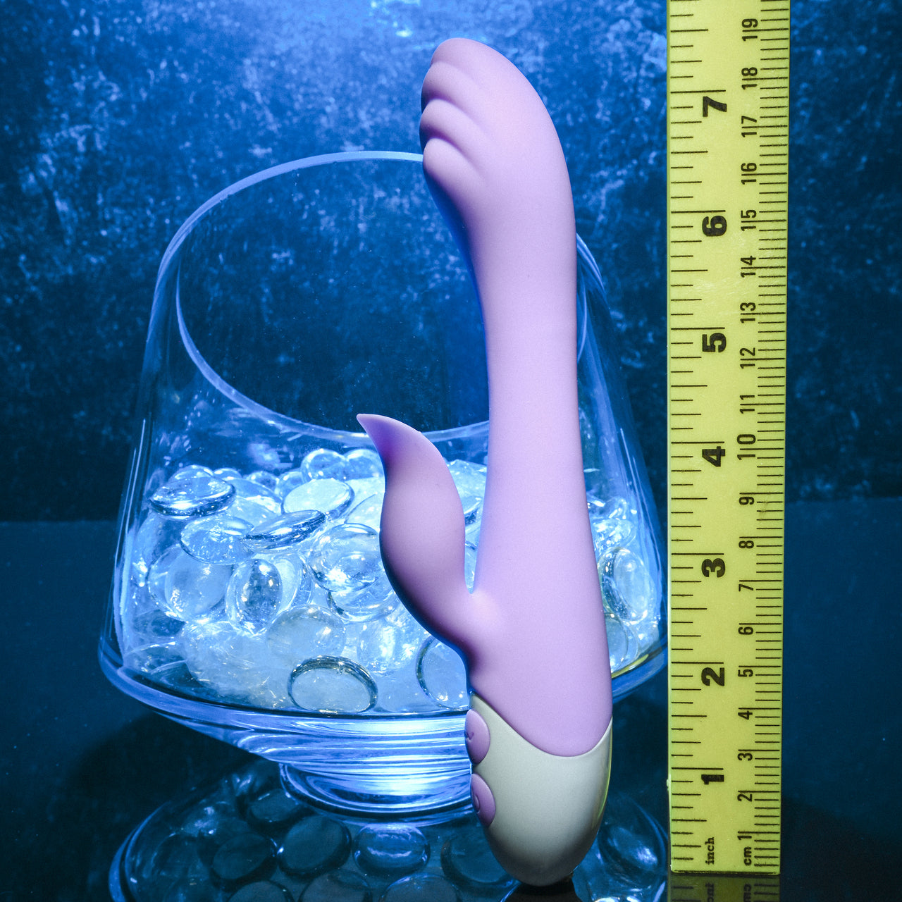 Evolved Pleasing Petal Rabbit Style Vibrator from Evolved Novelties. Let your fantasies take over with this creamy smooth Silicone vibe that curves gently with a deeply textured oval head. Enjoy the bulbous tip and flexible slender shaft that moves with your body as the multi-speed motor keeps up with your every desire. Find another 10 speeds of glory in the smaller petal-shaped shaft that features a tongue in the center, designed to target your most sensitive areas. It licks its heart out at the exact speed you command as you customize your experience by using each motor independently. Completely water submersible and easy to clean.