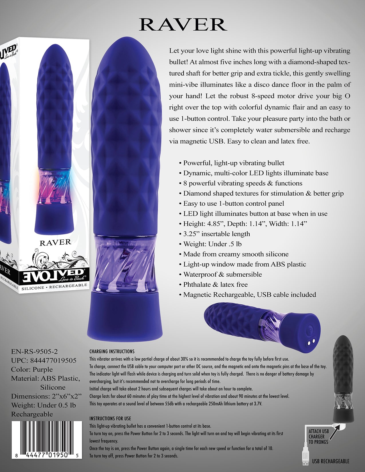 Evolved Raver Bullet Vibrator from Evolved Novelties. Love is back! Let your love light shine with this powerful light up vibrating bullet! At almost five inches long with a diamond shaped textured shaft for better grip and extra tickle, this gently swelling mini vibe illuminates like a disco dance floor in the palm of your hand! Let the robust 8 speed motor drive your big O right over the top with colorful dynamic flair and an easy to use 1 button control. Take your pleasure party into the bath or shower since it is completely water submersible and recharge via magnetic USB. Alaways clean before and after use. Easy to clean. Latex free. Made using body safe materials: ABS Plastic, Silicone. 5 years warranty. Categories: Vibrators, Bullets, Eggs, Rechargeable Vibrators, Vibrating Bullets and Eggs. 2023.