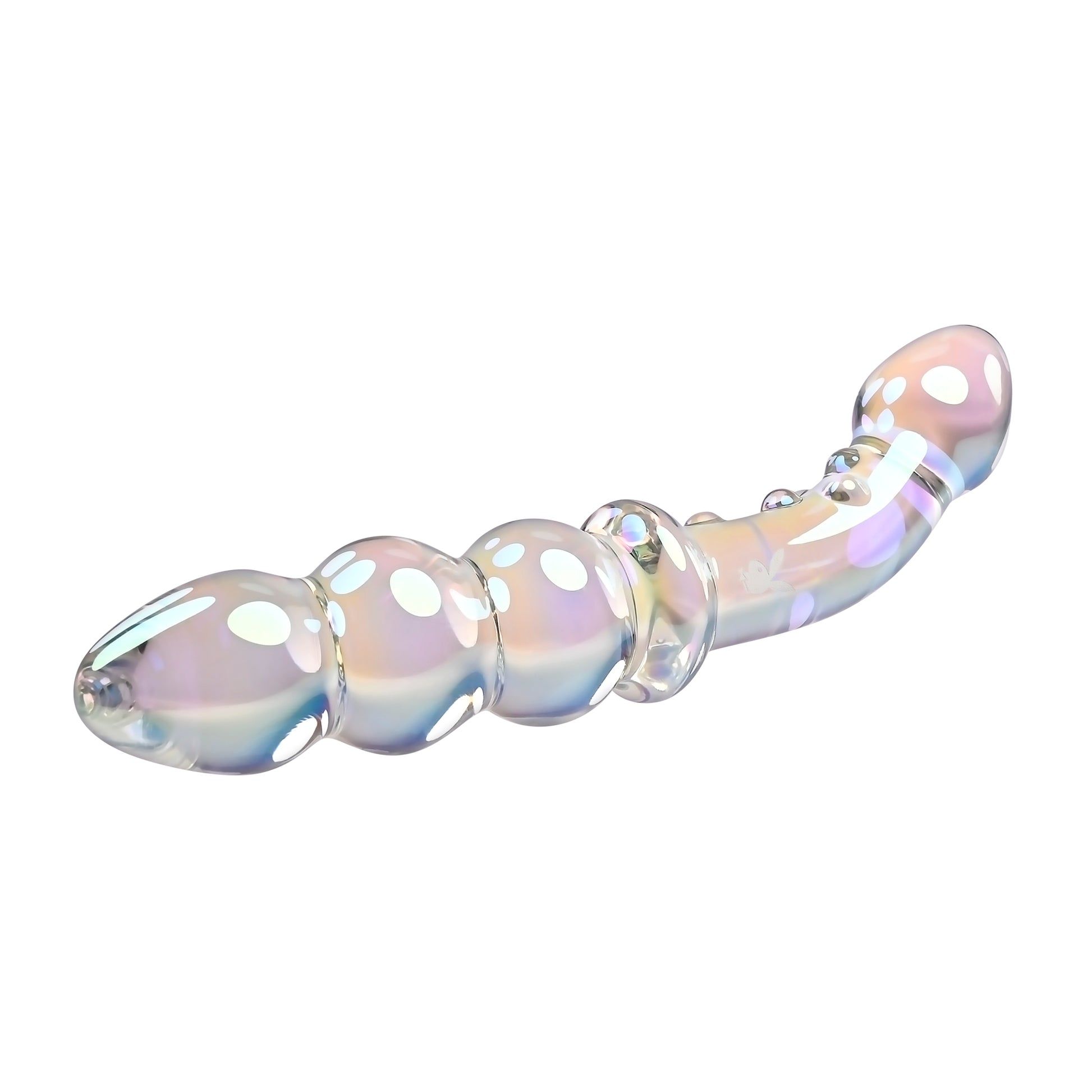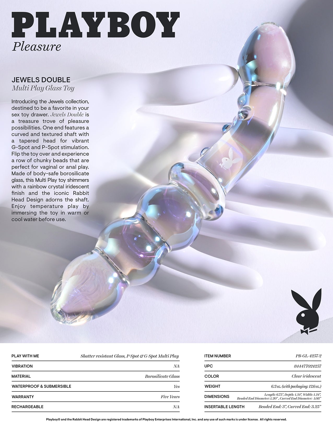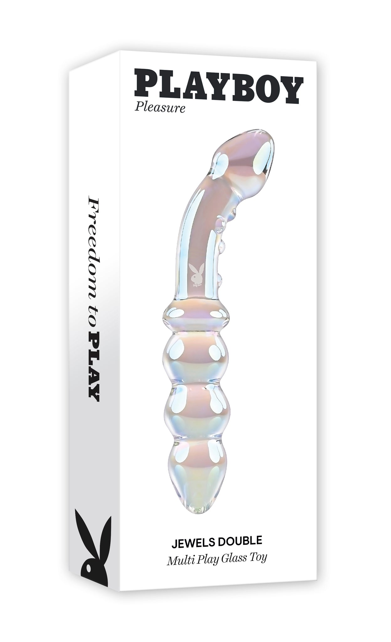 Playboy Jewel Double Multi Play Glass Sex Toy from Evolved Novelties. Introducing the Jewels collection, destined to be a favorite in your sex toy drawer. Jewels Double is a treasure trove of pleasure possibilities. One end features a curved and textured shaft with a tapered head for vibrant G-Spot and P-Spot stimulation. Flip the toy over and experience a row of chunky beads that are perfect for vaginal or anal play. Made of body safe Borosilicate Glass, this Multi Play toy shimmers with a rainbow crystal iridescent finish and the iconic Rabbit Head Design adorns the shaft. Enjoy temperature play by immersing the toy in warm or cool water before use. Panel details: Play with me key feature: shatter resistant Glass, P-Spot and G-Spot Multi Play. Non-vibrating probe. Material: Borosilicate Glass. Waterproof, submersible. 5 years warranty. Size specifications: height 6.75 inches, depth 1.24 inches, width 1.24 inches, Beaded end insertable length 3 inches, diameter 1.20 inches. Curved end insertable length 3.25 inches, diameter 1.08 inches. Categories: Anal Toys, Prostate Massagers, P-Spot Stimulators, Probes, Sticks, Rods, Dildos, Dongs, Double Dongs, G-Spot. 2024.
