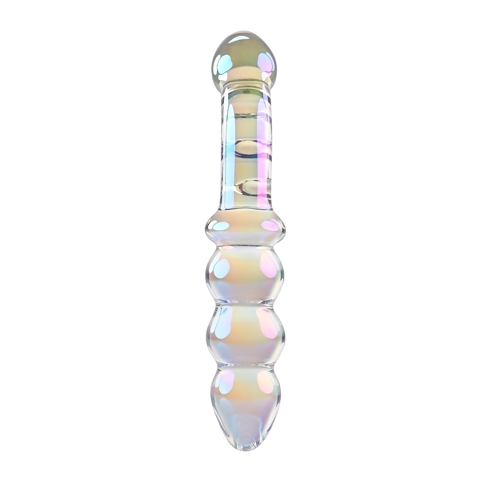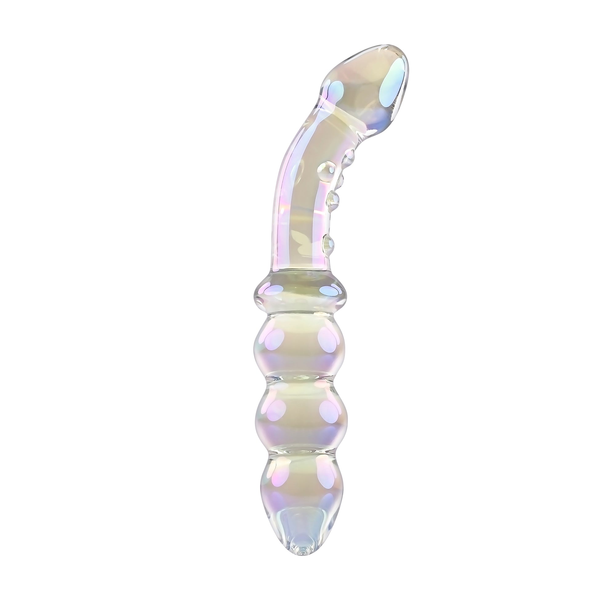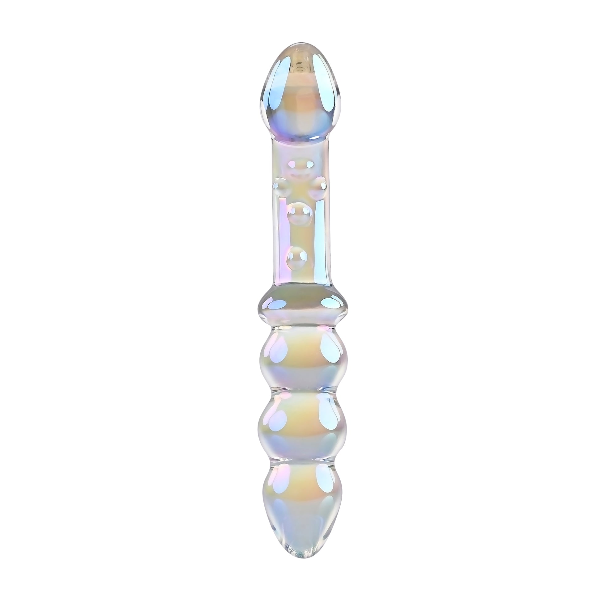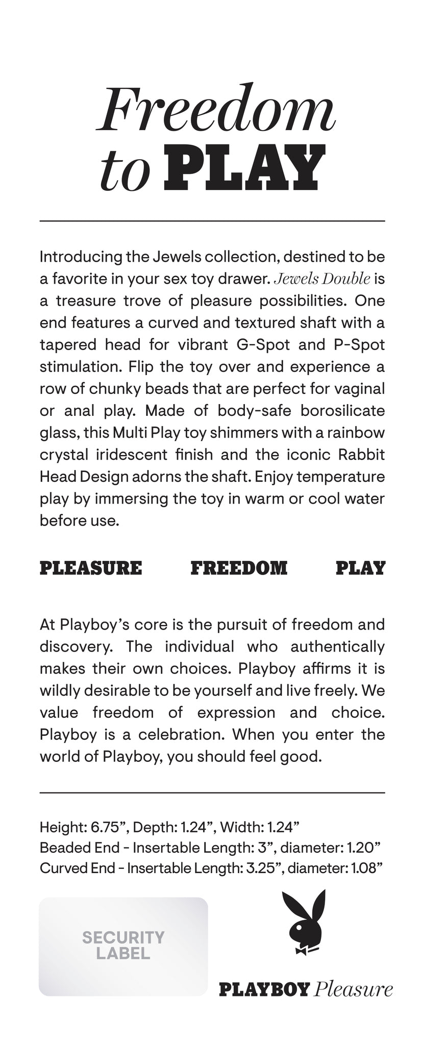 Playboy Jewel Double Multi Play Glass Sex Toy from Evolved Novelties. Introducing the Jewels collection, destined to be a favorite in your sex toy drawer. Jewels Double is a treasure trove of pleasure possibilities. One end features a curved and textured shaft with a tapered head for vibrant G-Spot and P-Spot stimulation. Flip the toy over and experience a row of chunky beads that are perfect for vaginal or anal play. Made of body safe Borosilicate Glass, this Multi Play toy shimmers with a rainbow crystal iridescent finish and the iconic Rabbit Head Design adorns the shaft. Enjoy temperature play by immersing the toy in warm or cool water before use. Panel details: Play with me key feature: shatter resistant Glass, P-Spot and G-Spot Multi Play. Non-vibrating probe. Material: Borosilicate Glass. Waterproof, submersible. 5 years warranty. Size specifications: height 6.75 inches, depth 1.24 inches, width 1.24 inches, Beaded end insertable length 3 inches, diameter 1.20 inches. Curved end insertable length 3.25 inches, diameter 1.08 inches. Categories: Anal Toys, Prostate Massagers, P-Spot Stimulators, Probes, Sticks, Rods, Dildos, Dongs, Double Dongs, G-Spot. 2024.